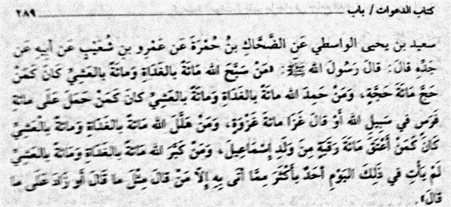“Sesiapa yang bertasbih mensucikan Allah 100 kali waktu pagi dan 100 kali waktu petang, maka dia seumpama orang yang mengerjakan 100 kali haji; Sesiapa yang bertahmid memuji Allah 100 kali waktu pagi dan 100 kali waktu petang, maka dia seumpama orang yang membawa 100 ekor kuda di jalan Allah, atau – sabda baginda – orang yang berperang 100 peperangan (jihad); Sesiapa yang bertahlil mengesakan Allah 100 kali waktu pagi dan 100 kali waktu petang, maka dia seumpama orang yang memerdekakan 100 orang hamba daripada keturunan Nabi Isma`il; Dan sesiapa yang bertakbir membesarkan Allah 100 kali waktu pagi dan 100 kali waktu petang, maka tiada seorang pun yang datang pada hari tersebut membawa pahala amalan yang lebih banyak daripadanya selain orang yang mengucapkan takbir seperti yang dia baca atau lebih banyak lagi.”
