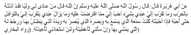 “Dari Abu Hurairah radhiyallahu ‘anhu ia berkata: telah bersabda Rasulullah shallallahu ‘alaihi wasallam,: “Sesungguhnya Allah telah berfirman: Barang siapa yang memusuhi Waliku maka sesungguhnya Aku telah menyatakan perang kepadanya, dan tidaklah seorang hamba-Kumendekatkan diri kepada-Ku dengan sesuatu ibadah yang lebih Aku cintai dari apa yang telah Aku wajibkan kepadanya, dan senantiasa seorang hamba-Ku mendekatkan diri kepada-Ku dengan amalan-amalan sunnah hingga Aku mencintainya. Jika Aku mencintainya jadilah aku sebagai pendengarannya yang ia gunakan untuk mendengar, dan sebagai penglihatannya yang ia gunakan untuk melihat, dan sebagai tangannya yang ia gunakan untuk berbuat, dan sebagai kakinya yang ia gunakan untuk berjalan. Dan jika ia meminta (sesuatu) kepada-Ku pasti Aku akan memberinya, dan jika ia memohon perlindungan dariKu pasti Aku akan melindunginya”.