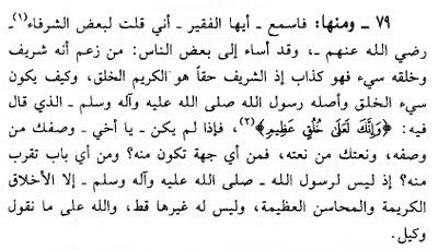 Dengarlah wahai faqir, bahawasanya aku telah menegur sebahagian syurafa` (yakni para syarif yang bernasab kepada Junjungan Nabi SAW) – moga-moga Allah meredhai mereka – yang melakukan kesalahan kepada sebahagian manusia: “Sesiapa yang mendakwa dirinya seorang syarif, sedangkan akhlak perilakunya keji, maka dia adalah seorang pendusta, kerana syarif yang sebenar adalah seorang yang mulia akhlaknya. Bagaimana dia boleh berakhlak keji, sedangkan dia berasal daripada Junjungan Nabi SAW – yang mana Allah telah berfirman memuji baginda : ” Dan sesungguhnya engkau memiliki akhlak yang amat agung.” Oleh itu, wahai saudaraku, sekiranya engkau tidak bersifat dengan sifat baginda, tidak berperangai dengan perangai baginda, maka dari arah mana jadinya engkau daripada baginda ? Dan dari pintu mana engkau hendak bertaqarrub dengan baginda ? Kerana tiadalah bagi Junjungan Rasulullah SAW itu selain daripada akhlak yang mulia dan kebaikan yang unggul semata-mata, sekali-kali baginda tidak memiliki akhlak dan perangai selainnya. Dan Allahlah sandaran atas apa yang kami nyatakan.