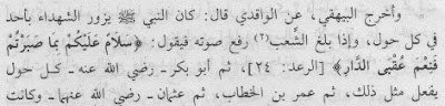 Dan diriwayatkan oleh Imam al-Baihaqi daripada al-Waaqidi yang menyatakan bahawa adalah Junjungan Nabi s.a.w. menziarahi para syuhada` yang gugur di medan Uhud pada setiap haul (setiap genap setahun). Ketika baginda sampai ke lembah tersebut, baginda mengangkat suara baginda yang mulia untuk mengucapkan salam: “Kedamaian dan kesejahteraan sentiasa bersama kamu, disebabkan kesabaran kamu ketika hidup di dunia dahulu. Maka alangkah baik tempat kesudahan (kamu) itu.” Kemudian perbuatan baginda ini telah dilaksanakan pula oleh Sayyidina Abu Bakar r.a. pada setiap haul, kemudian diteruskan oleh Sayyidina ‘Umar bin al-Khatthab r.a. dan Sayyidina ‘Uthman r.a…..”