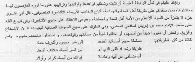 Dan kami menegaskan kepada kalian berhubung urusan ar-Rabithah al-‘Alawiyyah agar tetap kukuh dan istiqamah atas segala kaedah, peraturan dan susunan yang telah disusun oleh para pengasas dan pengurusnya yang terdahulu yang berjalan atas thoriqah (perjalanan) Ahlus Sunnah wal Jama`ah, mengikut mazhab yang empat lagi Asyaa`irah serta bertasawwuf. Keluarga Abi ‘Alawi (Ba ‘Alawi) adalah satu bahagian yang tidak terpisah daripada golongan terbanyak umat ini (as-sawadul a’dhzam) iaitu Ahlus Sunnah wal Jama`ah. Mereka dalam i’tiqad kepercayaan berpegang kepada manhaj al-‘Asyaa`irah, dalam furu’ fiqh berpegang dengan mazhab Imam Muhammad bin Idris asy-Syafi`i al-Mutholibi serta menjalani manhaj tasawwuf yang suci dan jauh dari segala bid`ah dan penyelewengan. Maka jaga-jaga jangan sampai mengubah sesuatu dari apa yang telah mereka asaskan atau menyimpang dari jalan dan kaedah mereka atau menggantikannya dengan manhaj selain manhaj mereka, walau bagaimana pun rupa bentuknya. Maka thoriqah (perjalanan) mereka adalah (sebagaimana dinyatakan oleh Imam al-Haddad):-