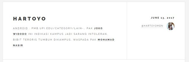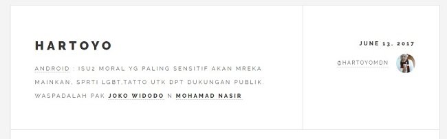 Dalam cuitan di akun twitter pribadinya pada Selasa (13/6), ia menyebut isu sensitif tersebut dimainkan untuk mendapat dukungan dari publik. Ia juga berharap Jokowi dan Menristekdikti waspada akan hal tersebut.