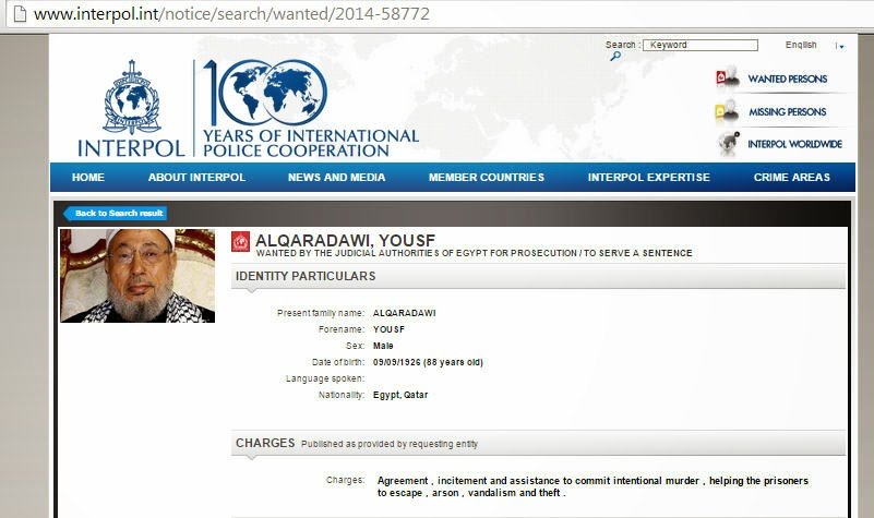 Penelusuran islamedia.co pada sabtu 27 Desember 2014 langsung ke website www.interpol.int, nampak terpampang foto Syeikh Yusuf Qardhawi dengan keterangan bahwa menjadi buronan pemerintah Mesir.