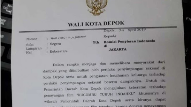 “Untuk itu Pemerintah Kota Depok mengajukan keberatan terhadap penayangan film Kucumbu Tubuh Indahku, khususnya di wilayah Pemerintah Daerah Kota Depok serta kiranya dapat menghentikan penayangan film tersebut,” katanya.
