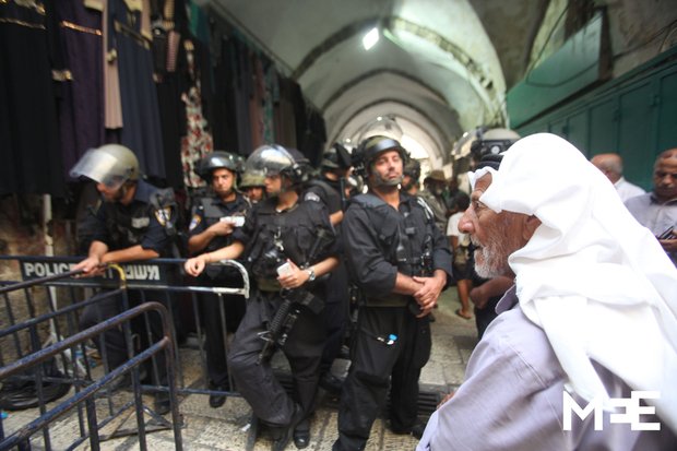 Polisi Israel membuat titik-titik pemeriksaan di sepanjang Yerussalem pada Jumat (18/08/2015), mencegah orang-orang memasuki Masjid Al-Aqsa